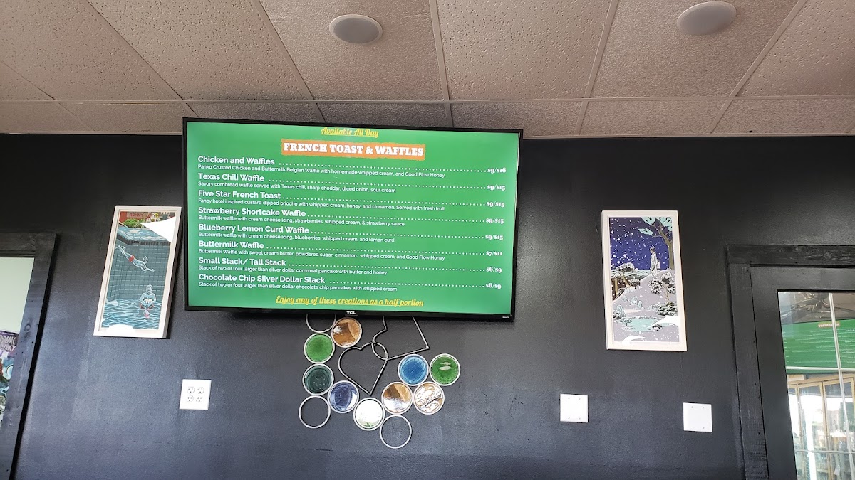 Buttermilk Belgian waffle topped with homemade whipped cream, local good flow honey, powdered sugar, and cinnamon